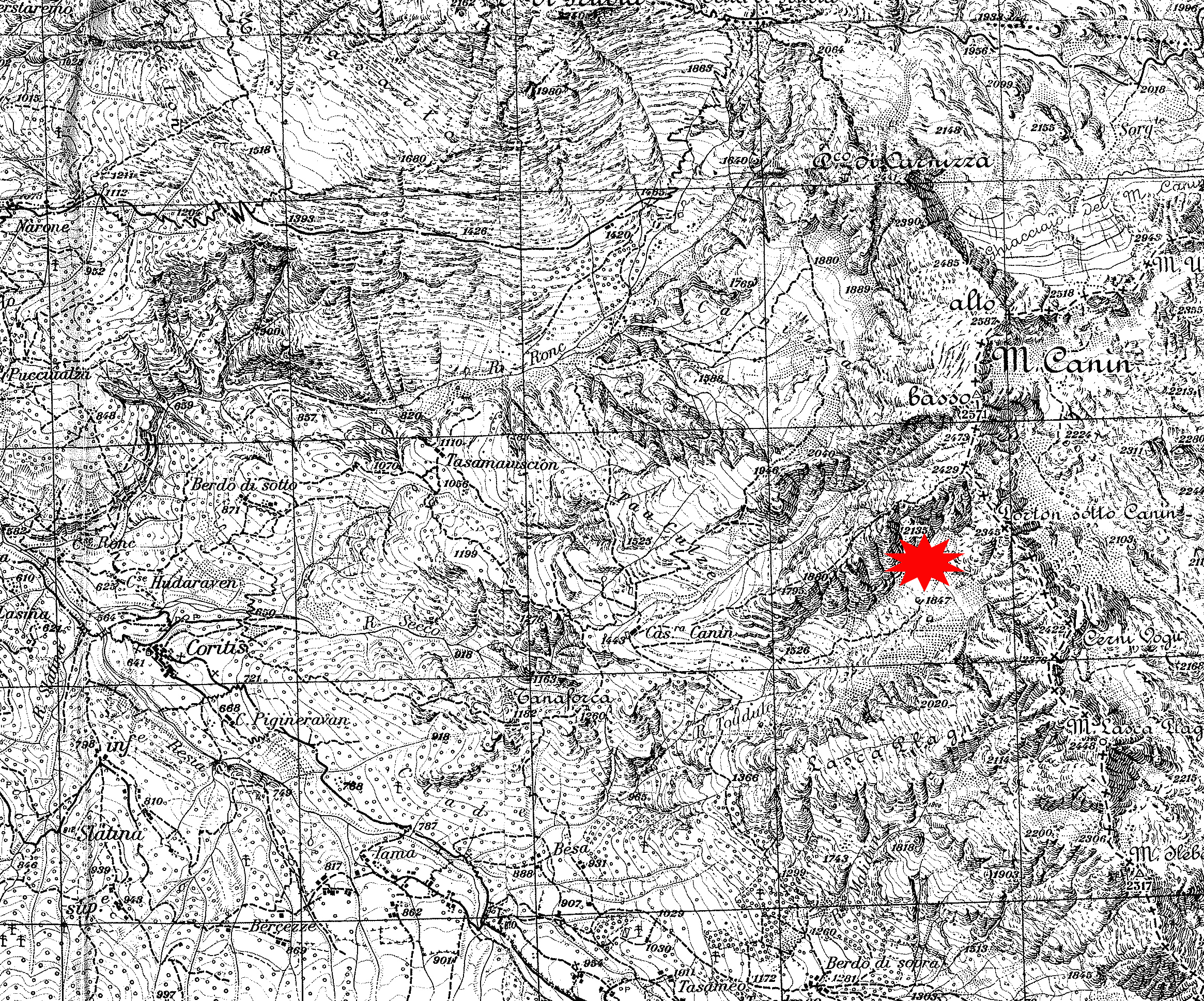 Shortly after in the val Resia villages, not so far away, a rumble of engines was briefly heard and then a violent roar happened [28]. The B-24 had crashed on a rocky wall that is part of the south buttress of Mount Canin, below the summit of the Porton sotto Canin (Čez Dol) peak, at an altitude of about 6,230 feet (1,900 meters). Most of the wreck rolled then downstream, along the canyon where the Toudùle torrent flows.