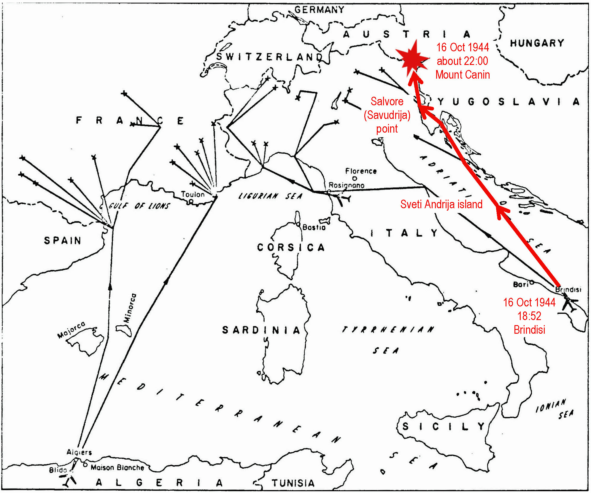 The route followed by the B-24 J 42-51778 on the evening of 16 October 1944.