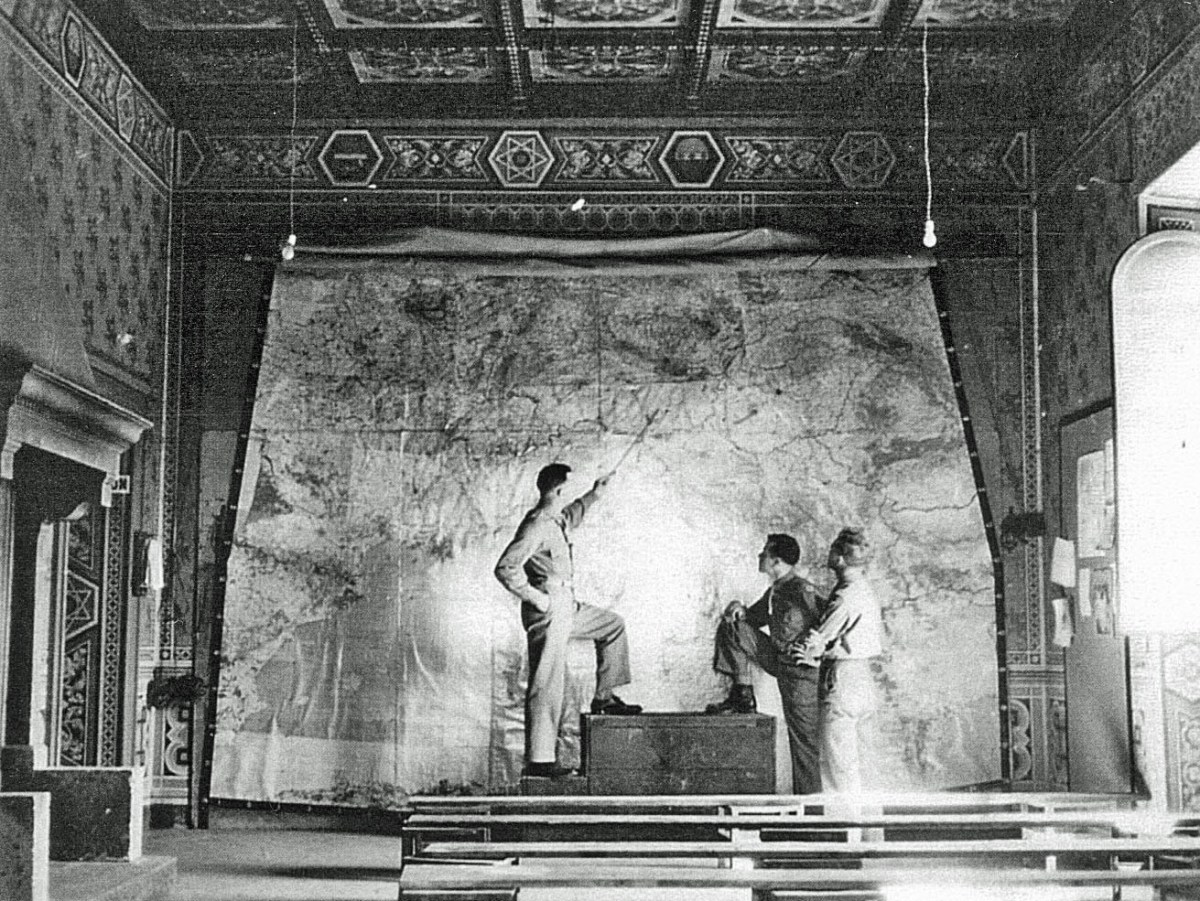 CA003 Castiglioncello HQ Published 01/03/2016 at 1311 × 985 in Photogallery of the 885th BS ← Previous The briefing room with the big wall map, the most guarded asset of 15th SG / 885th & 859th BS. Pasquini Castle, Castiglioncello, Italy. April 1945.